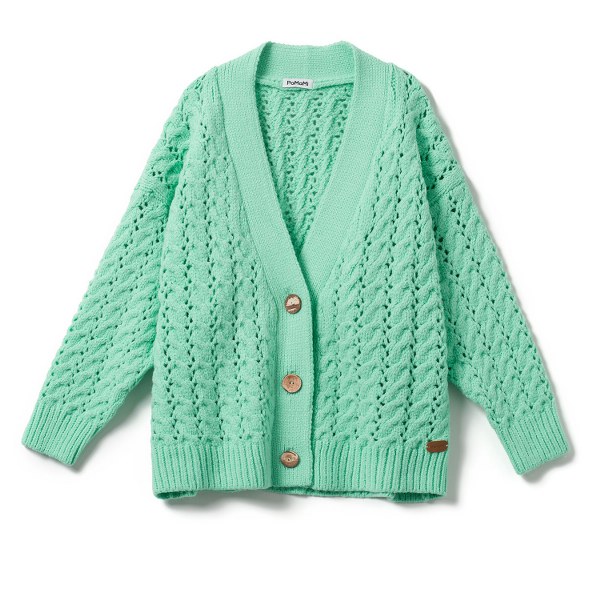 Ażurowy sweterek na guziki w kolorze zielonym to elegancki i komfortowy element damskiej garderoby. Wykonany z mieszanki akrylu, poliamidu i elastanu, kardigan jest miękki, przyjemny w dotyku i nie drapie skóry. Zapinany na trzy guziki, z dekoltem w kształcie litery "V" i grubym warkoczowym splotem, doskonale komponuje się z różnymi stylizacjami. Uniwersalny rozmiar sprawia, że sweter pasuje na każdą sylwetkę, zapewniając ciepło w chłodniejsze dni.