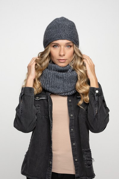 Ciemnoszary komplet damski na zimowe spacery, wykonany z mieszanki wełny jagnięcej i bawełny. Czapka o standardowym kroju, podszyta polarem, zapewnia maksymalne ciepło, jednocześnie pozwalając skórze oddychać. Komin zawijany na dwa razy, idealnie przylega do szyi, chroniąc przed wiatrem i chłodem. Stylowy i uniwersalny, doskonały na każdą okazję.