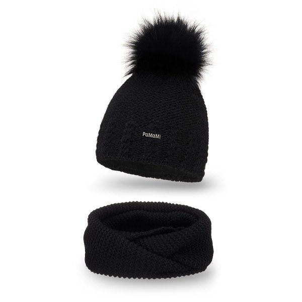 Czarny komplet dla kobiet PaMaMi, składający się z czapki z futerkowym pomponem i komina, zapewnia ciepło i elegancję w chłodne dni. Wykonany z miękkiego materiału (85% akryl, 15% poliamid), zestaw jest niezwykle komfortowy i ciepły. Czapka ma standardowy krój, delikatnie dłuższy od wersji ściśle dopasowanej do głowy, z polarowym podszyciem (1/2) dla dodatkowej izolacji cieplnej. Futerkowy pompon z włókien akrylowych dodaje uroku, a delikatny wzór przy ściągaczu podkreśla stylowy wygląd. Komin można owinąć wokół szyi na dwa razy, co zapewnia dodatkową ochronę przed wiatrem.