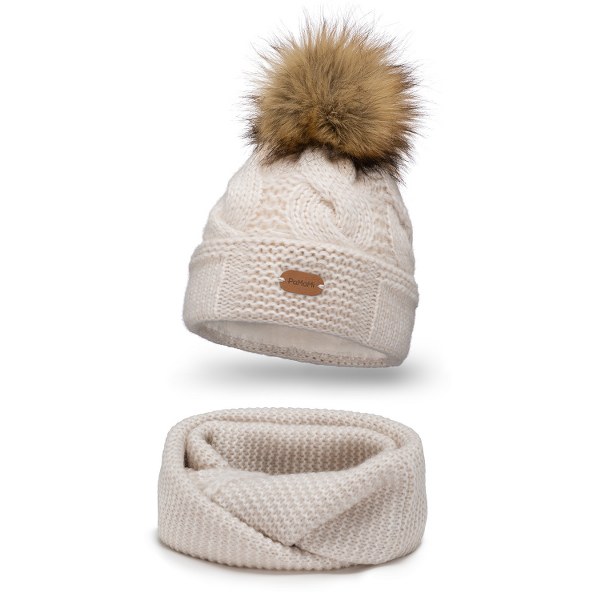 Komplet damski w kolorze ecru na zimowe dni składający się z klasycznej czapki z wywinięciem i futerkowym pomponem oraz komina do owinięcia na dwa razy. Czapka jest podszyta miękkim polarem, zapewniając dodatkowe ciepło i komfort. Idealny wybór na zimowe spacery, kiedy chcesz wyglądać elegancko i czuć się przytulnie. Komplet wykonany z mieszanki - 51% wełna jagnięca, 49% bawełna.