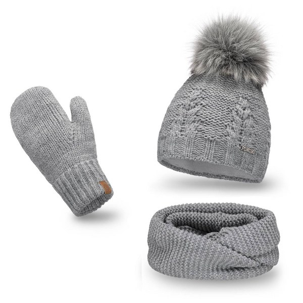 Jasnoszary komplet damski PaMaMi to idealny wybór dla kobiet, które cenią sobie zarówno styl, jak i funkcjonalność. Zestaw zawiera stylową czapkę z futerkowym pomponem, otulający komin na dwa razy oraz rękawiczki. Wykonany z miękkiego materiału akrylowego, zapewnia ciepło nawet w najchłodniejsze dni. Polarowe podszycie czapki nie tylko zwiększa komfort noszenia, ale także chroni przed zimnem. Komin z kompletu jest na tyle długi, że można go wygodnie owinąć wokół szyi dwa razy. Taki sposób noszenia nie tylko dodaje uroku, ale również zapewnia dodatkową ochronę przed chłodem. Rękawiczki są delikatne dla skóry i nie krępują ruchów dłoni.