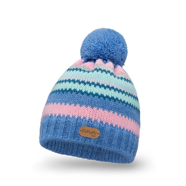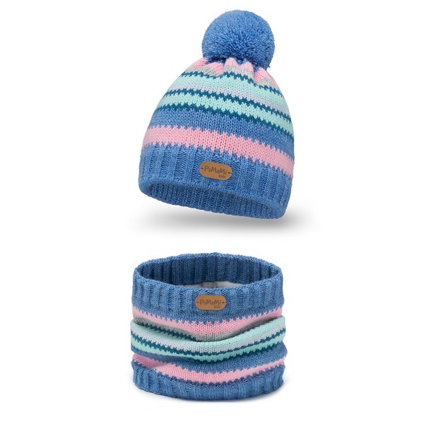 Niebieski komplet dziecięcy, składający się z czapki z kolorowymi paskami oraz pomponem i dopasowanego komina. Czapka została podszyta miękkim polarem, co zapewnia ochronę przed mrozem nawet w najchłodniejsze dni. Komin typu tuba idealnie przylega do szyi, gwarantując ciepło i komfort noszenia. Dzięki zastosowaniu delikatnych materiałów, zestaw jest przyjazny dla skóry dziecka, nie powodując podrażnień.