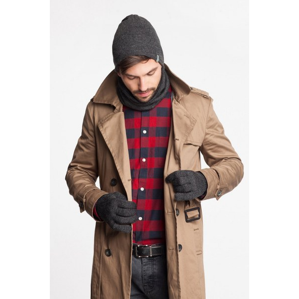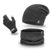 Komplet dla mężczyzn w kolorze ciemnoszara mulina, składający się z przedłużanej czapki typu smerfetka, komina i rękawiczek. Wykonany z wysokiej jakości 100% akrylu, zestaw zapewnia ciepło i komfort noszenia. Czapka z podwójnej dzianiny chroni przed utratą ciepła, a komin typu tuba idealnie dopasowuje się do szyi, skutecznie zabezpieczając przed wiatrem. Rękawiczki z pięcioma palcami zakończone specjalną przędzą pozwalają na obsługę smartfona bez konieczności ich zdejmowania.