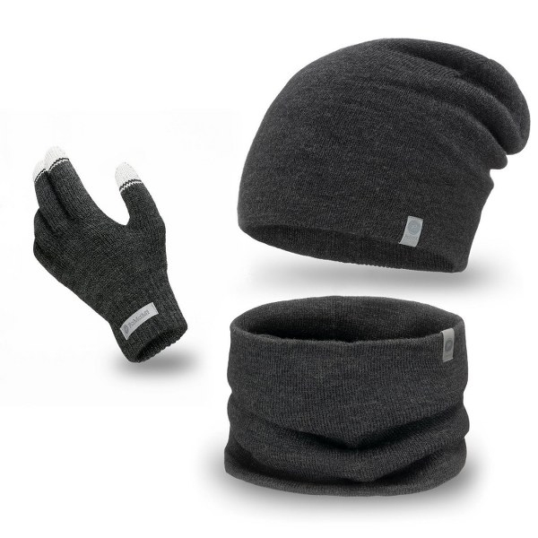 Ciemnoszary komplet dla mężczyzn, składający się z przedłużanej czapki typu smerfetka, komina i rękawiczek. Wykonany z wysokiej jakości 100% akrylu, zestaw zapewnia ciepło i komfort noszenia. Czapka z podwójnej dzianiny chroni przed utratą ciepła, a komin typu tuba idealnie dopasowuje się do szyi, skutecznie zabezpieczając przed wiatrem. Rękawiczki z pięcioma palcami zakończone specjalną przędzą pozwalają na obsługę smartfona bez konieczności ich zdejmowania.