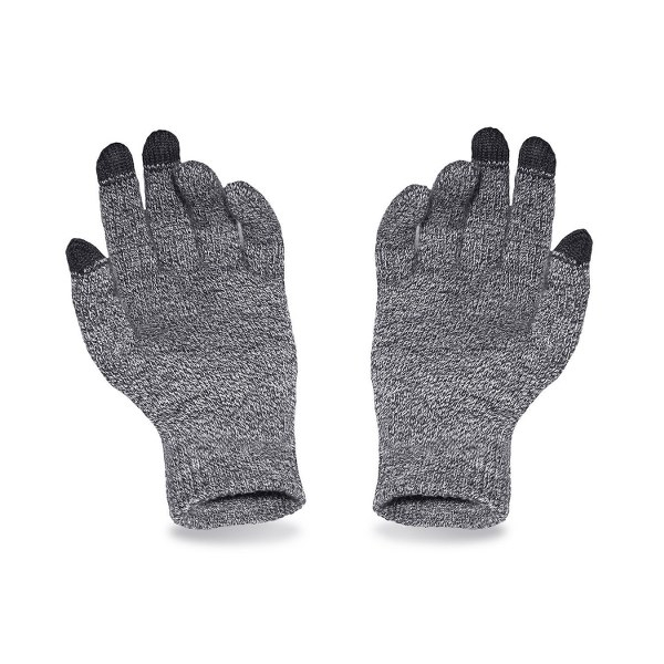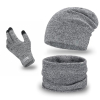 Komplet dla mężczyzn w kolorze jasnoszara mulina, składający się z przedłużanej czapki typu smerfetka, komina i rękawiczek. Wykonany z wysokiej jakości 100% akrylu, zestaw zapewnia ciepło i komfort noszenia. Czapka z podwójnej dzianiny chroni przed utratą ciepła, a komin typu tuba idealnie dopasowuje się do szyi, skutecznie zabezpieczając przed wiatrem. Rękawiczki z pięcioma palcami zakończone specjalną przędzą pozwalają na obsługę smartfona bez konieczności ich zdejmowania.