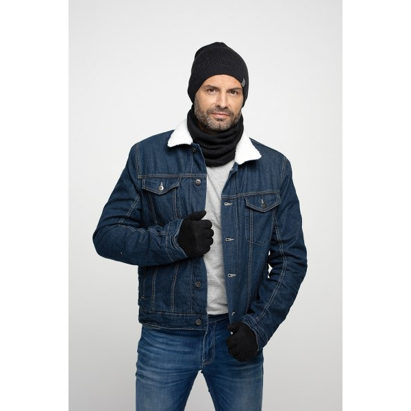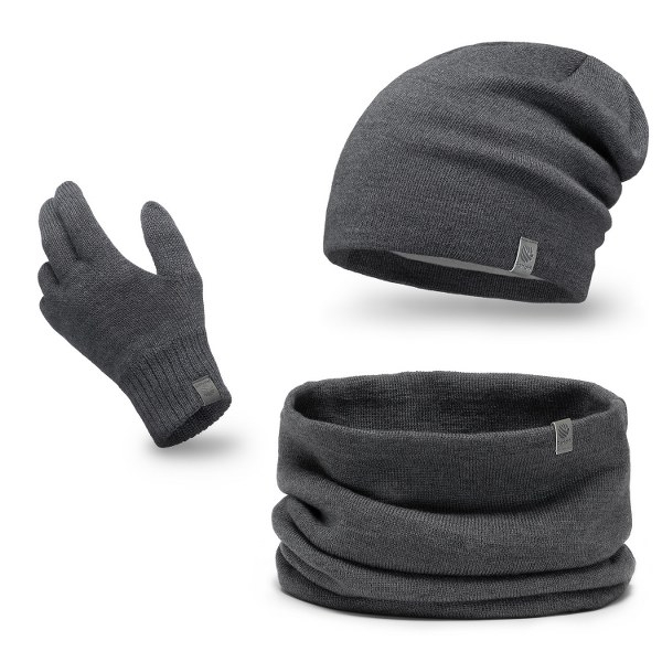 Ciemnoszary komplet zimowy dla mężczyzn, wykonany w 100% z wełny jagnięcej, składa się z przedłużanej czapki typu smerfetka, luźnego komina typu tuba oraz rękawiczek. Czapka jest podszyta miękkim polarem na 3/4 wysokości, zapewniając dodatkową ochronę przed zimnem. Komin doskonale chroni szyję, a jego luźny fason umożliwia wygodne noszenie. Rękawiczki dopełniają zestaw, chroniąc dłonie przed mrozem. Komplet jest idealny na zimowe spacery, łącząc funkcjonalność i elegancję.